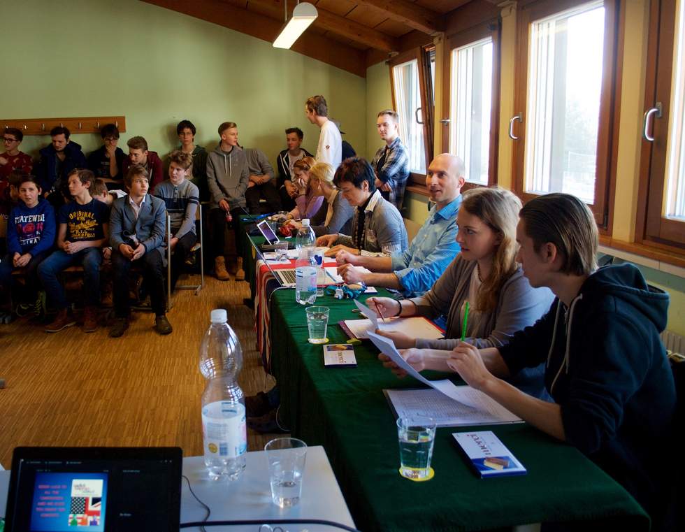 Die vier Bestplazierten der ersten beiden Runden der 3. – 5. Jahrgänge qualifizierten sich für das Finale des Contests. In einer zehnminütigen Diskussion, die von allen vier SchülerInnen auf höchstem sprachlichen Niveau geführt wurde, machten die vier Finalisten es der Jury sicherlich nicht einfach, zu einem für alle gerechten Ergebnis zu kommen. Um 15:00 Uhr war es dann soweit: nach einem sowohl für die KandidatInnen als auch für die Jury recht anstrengenden Tag konnten wir endlich zur Siegerehrung schreiten.