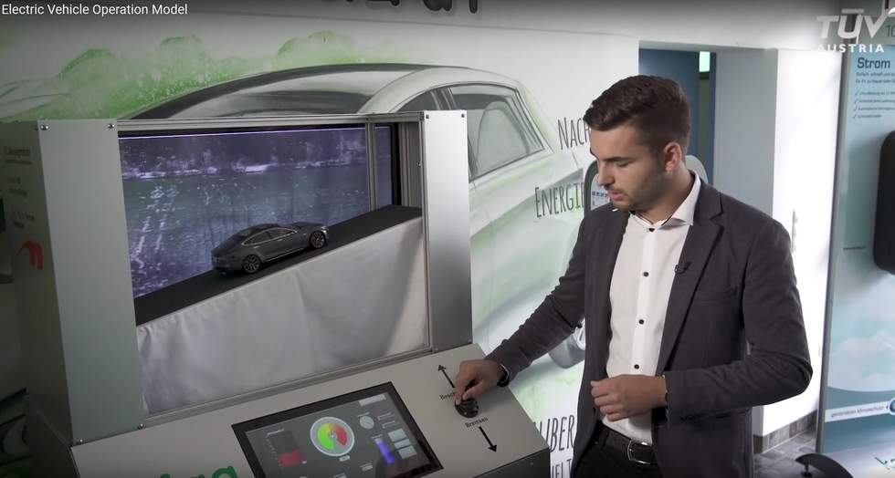 Andreas Feik und Johannes Kraiger von der HTL Klagenfurt Mössingerstraße werben mit einem Energieverbrauch-Simulator für Elektroautos um die Gunst des sicherheitstechnisch interessierten Publikums. Das Maturaprojekt entstand in Kooperation mit dem Kärntner Energieversorger KELAG und gibt einen verständlichen Einblick in Fahrweise und Betriebsart von Elektroautos.