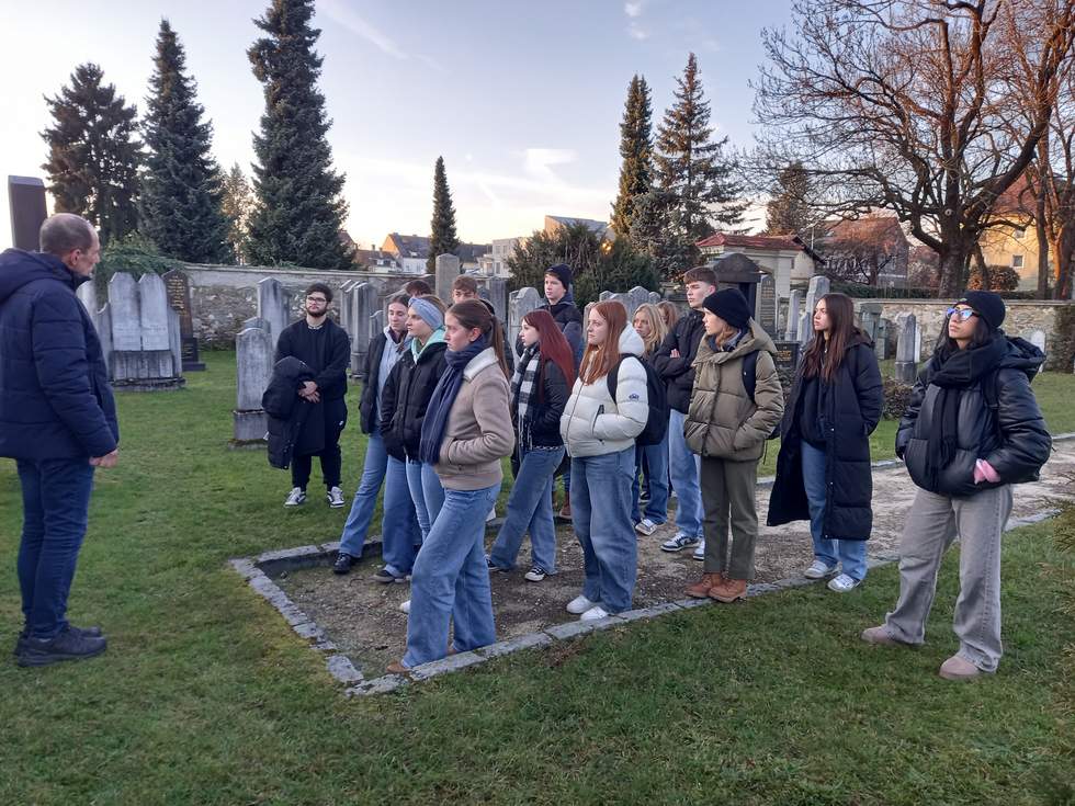 Gemeinsam mit ihrer Ethiklehrerin Gerda Wobik besichtigten die Jugendliche zuerst den jüdischen Teil des Friedhofs Sankt Ruprecht wo sie Details aus den Leben der Kärntner Jüdinnen und Juden erfuhren und regen Anteil an den zahlreichen Geschichten nahmen.