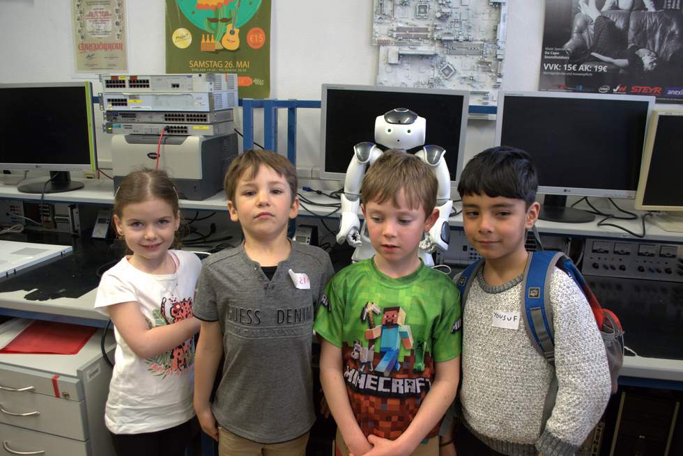Die Kinder des Kindergartens Welzenegg und ihre Pädagoginnen erlebten mit den Tutorinnen und Tutoren der 2AHBG einen spannenden Vormittag in den Werkstätten der HTL.